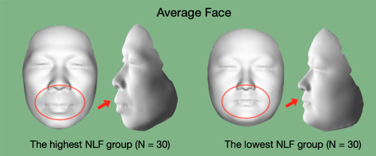 To better understand the relationship between nasolabial folds and facial morphological structures, the research team also collected and generated 3D data for the faces of the test subjects. It can be seen that the “nose-mouth area” in the middle of the face is more prominent in subjects with severe nasolabial folds (highlighted in red). Also, previous anatomical studies on nasolabial folds enhanced the findings of this study.